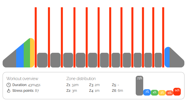 …以降、レストを1本ごとに5秒ずつ短縮し、最終的に1分50秒まで詰める。 - クールダウン:約5分(70〜30%FTPへ下げながら終了)